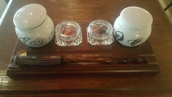 整套含陶瓷瓶2個,小墨水瓶2個,花梨木筆座1個,沾水筆1枝。